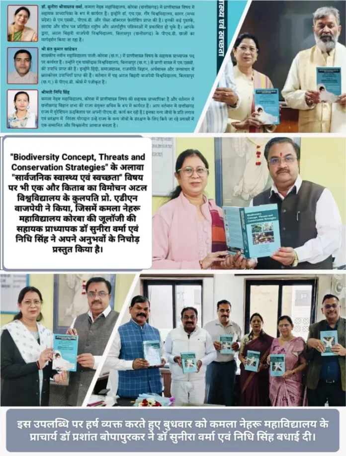 कोरबा। जैव विविधता की अवधारणा, खतरे और संरक्षण रणनीतियां, विषय पर जीवविज्ञानी डॉ सुनीरा वर्मा के संपादन में प्रकाशित पुस्तक का विमोचन किया गया। छत्तीसगढ़ के उच्च शिक्षा आयुक्त डॉ संतोष कुमार देवांगन ने संचालनालय में इस किताब का विमोचन किया। डॉ वर्मा ने कहा कि सेव वर्ल्ड की थीम पर यह पुस्तक हमारी प्रकृति, वन्य प्राणियों, जल-थल और वायु समेत पारिस्थितिकी तंत्र में बदलाव और उसके मानव समाज पर प्रभाव पर फोकस करता है। इसके अलावा सार्वजनिक स्वास्थ्य एवं स्वच्छता विषय पर भी एक और किताब का विमोचन अटल बिहारी वाजपेयी विश्वविद्यालय में कुलपति प्रो एडीएन वाजपेयी ने किया, जिसमें स्नातक कक्षाओं के लिए इकाईवार विद्यार्थियों की सुविधा के लिए पाठ्यक्रम से जुड़े प्रश्नों का सरल-सुलभ संग्रहण प्रस्तुत किया गया है। किताब के माध्यम से कमला नेहरु महाविद्यालय में जूलॉजी की विभागाध्यक्ष डॉ सुनीरा वर्मा एवं सहायक प्राध्यापक श्रीमती निधि सिंह समेत विषय विशेषज्ञों की उनकी टीम ने जैव विविधता की अहमियत, अनियंत्रित दोहन के भावी खतरे की ओर ध्यानाकर्षित करते हुए संरक्षण रणनीतियों पर सुझाव प्रस्तुत किया है, ताकि भावी पीढ़ी के लिए शुद्ध आबोहवा व सुरक्षित पर्यावरण सहेजने के ठोस और व्यापक कदम उठाए जा सकें। इस उपलब्धि पर हर्ष व्यक्त करते हुए बुधवार को कमला नेहरू महाविद्यालय के प्राचार्य डॉ प्रशांत बोपापुरकर ने डॉ सुनीरा वर्मा एवं निधि सिंह बधाई दी। उन्होंने कहा कि विषय विशेषज्ञों द्वारा अपने अनुभवों से तैयार की गई इस पुस्तक का लाभ निश्चित तौर पर शोधार्थियों और मानव समाज को नई दिशा प्रदान करेगा। ये पुस्तकें विज्ञान के हमारे विद्यार्थियों के लिए लाभप्रद साबित होगा।