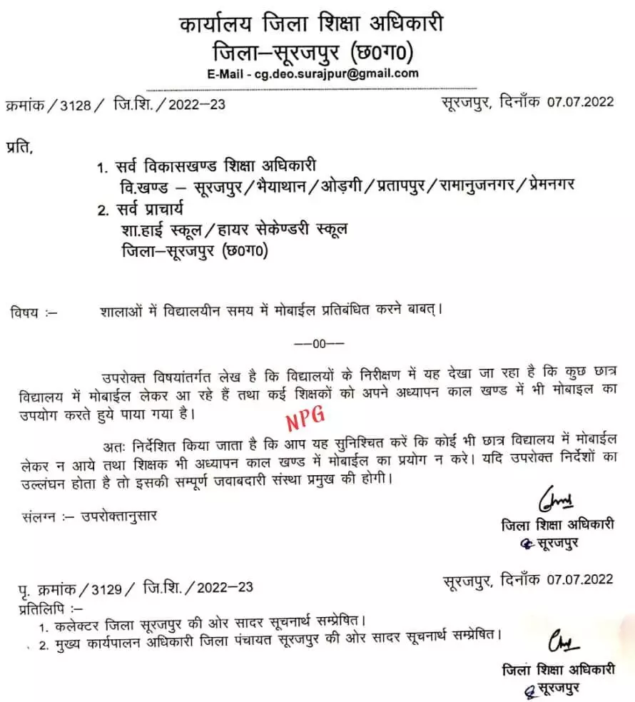 सूरजपुर छात्रों के स्कूल के दौरान मोबाइल लेकर आने को सूरजपुर में बैन कर दिया गया है। तो वही शिक्षको को सिर्फ अपने अध्यापन काल खंड में मोबाइल इस्तेमाल की मनाही है। पढ़ाई के दौरान डिस्टर्बेंस के चलते एसा आदेश जिला शिक्षा अधिकारी ने जारी किया है। आदेश में स्पष्ट है कि सिर्फ पढ़ाने के दौरान शिक्षक मोबाइल का इस्तेमाल न करें। बाकी पीरियड के गैप या लंच आवर में कोई रोक नहीं है।