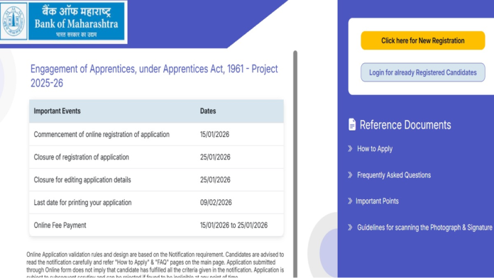 नई दिल्ली। बैंकिंग सेक्टर में करियर बनाने का सपना देख रहे युवाओं के लिए अच्छी खबर है। बैंक ऑफ महाराष्ट्र (Bank of Maharashtra) ने अप्रेंटिसशिप भर्ती के लिए आवेदन प्रक्रिया शुरू कर दी है। इस भर्ती के तहत ग्रेजुएट युवाओं को बैंक में प्रशिक्षण (Apprenticeship) पाने का अवसर मिलेगा। इच्छुक और योग्य अभ्यर्थी बैंक की आधिकारिक वेबसाइट के माध्यम से ऑनलाइन आवेदन कर सकते हैं।