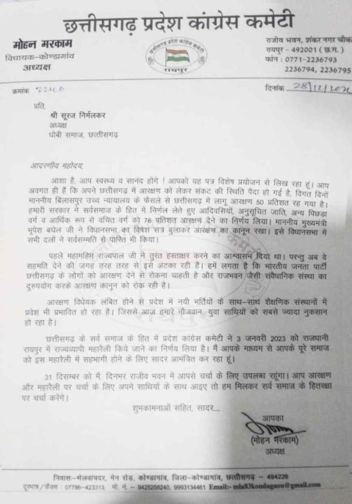 पीसीसी अध्यक्ष मोहन मरकाम ने समाज प्रमुखों को लिखे अपने पत्र में बताया कि उच्च न्यायालय के फैसले से छत्तीसगढ़ में लागू आरक्षण 50 प्रतिशत रह गया है. इस पर हमारी सरकार ने सर्वसमाज के हित में निर्णय लेते हुए 76 प्रतिशत आरक्षण देने का निर्णय लिया. इसके लिए मुख्यमंत्री भूपेश बघेल ने विधानसभा का विशेष सत्र बुलाकर आरक्षण का कानून रखा, जिसे सर्वसम्मति से पारित भी किया.