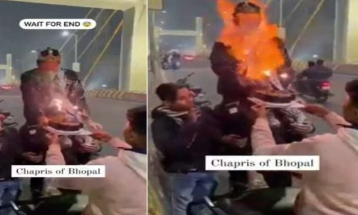भोपाल। बर्थडे हर इंसान के लिए खास दिन होता है। आज के समय में बर्थडे सेलिब्रेट (Birthday celebrate) करने के तरह-तरह की ट्रेंड सामने आ रहे हैं। सोशल मीडिया में आए दिन ऐसे वीडियो वायरल होते हैं, जिसमें कई बड़े हादसे दिखते हैं। एक ऐसा ही वीडियो राजधानी भोपाल से सामने आया है। जिसमें एक बर्थडे पार्टी के दौरान थोड़ी सी लापरवाही भारी पड़ गई। सेलिब्रेशन के दौरान केमिकल वाला स्प्रे करने से बर्थडे बॉय के मुंह में आग लग गई। इसका वीडियो तेजी से वायरल हो रहा है।दरअसल, राजभोज ब्रिज पर हैप्पी बर्थडे का जश्न मानना एक युवक को भारी पड़ा गया। युवक अपने दोस्तों के साथ मस्ती करते हुए जन्मदिन मना रहा था। लेकिन दोस्तों की गलती ने उसे मौत के मुंह तक ले गया। हुआ यूं कि केक और केमिकल वाला स्प्रे करने से बर्थडे बॉय के मुंह में आग लग गई। हालांकि वह बाल-बाल बच गया। सोशल मीडिया पर वीडियो तेजी से वायरल हो रहा है। बता दें कि वीडियो और रिल्स बनाने के शौकीनों का VIP रोड अड्डा बना हुआ है।