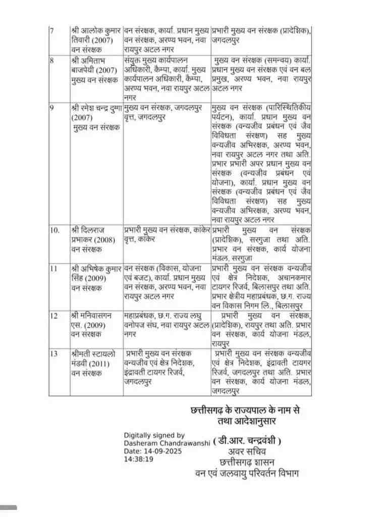 फेरबदल की सूची में प्रदेश के कई प्रमुख जिले जैसे रायपुर, दुर्ग, बिलासपुर, सरगुजा और बस्तर के अधिकारी शामिल हैं।