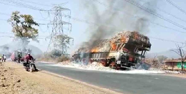 तेंदूपत्त्ते से भरे ट्रक में लगी आग, लाखों का माल जलकर खाक