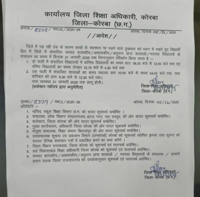 कोरबा। जिले में बढ़ती ठंड और बच्चों के स्वास्थ्य पर पड़ते प्रभाव को देखते हुए जिला शिक्षा अधिकारी ने सभी स्कूलों के समय में तुरंत बदलाव का आदेश जारी किया है। यह आदेश शासकीय, अशासकीय, अनुदान प्राप्त और मदरसा स्कूलों पर लागू होगा।