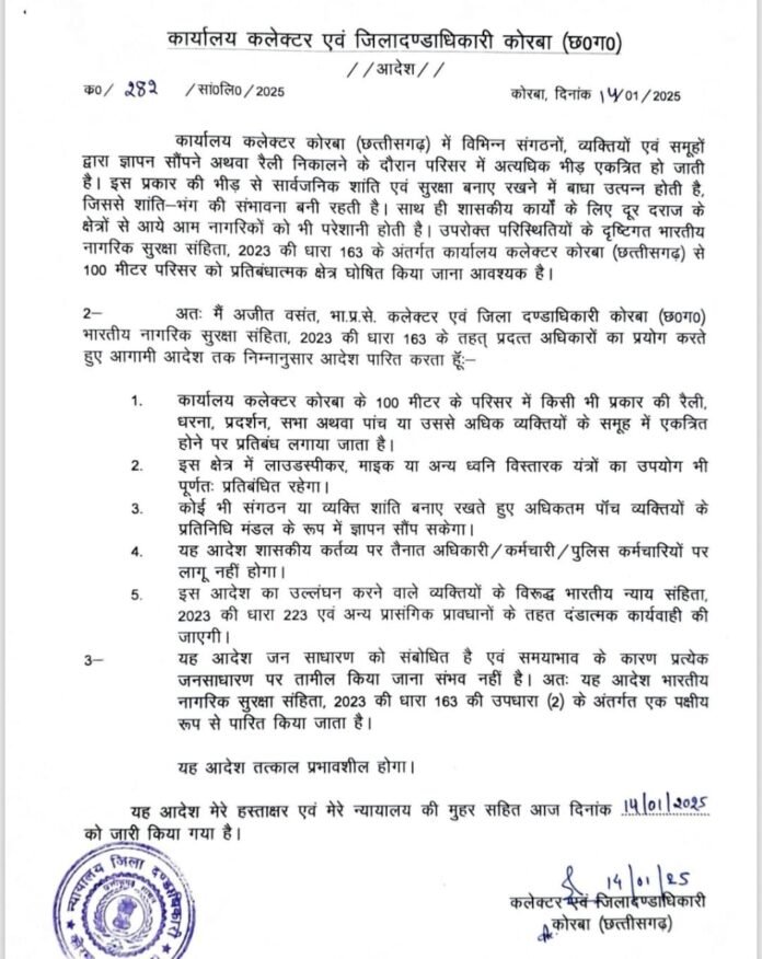 कोरबा: कलेक्टर कार्यालय से 100 मीटर के परिसर में भारतीय नागरिक सुरक्षा संहिता 2023 की धारा 163 (पूर्व में धारा 144) लागू कर दी गई है। यह फैसला कानून-व्यवस्था बनाए रखने और सार्वजनिक सुरक्षा को सुनिश्चित करने के लिए लिया गया है।