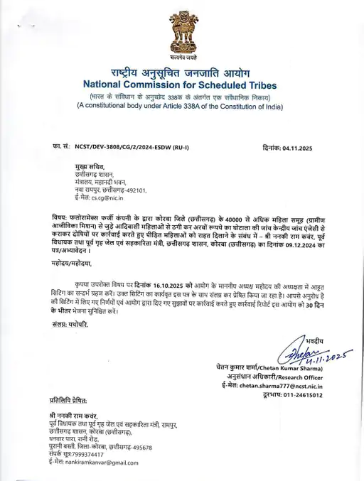 आयोग ने अपनी सिफारिश में कहा कि यह मामला गंभीर वित्तीय अनियमितता और आदिवासी महिलाओं के आर्थिक शोषण से जुड़ा है। इसलिए इसमें SC-ST अत्याचार निवारण अधिनियम के तहत अपराध दर्ज करते हुए समयबद्ध जांच सुनिश्चित की जाए। साथ ही, आयोग ने कहा कि जांच एजेंसी द्वारा तैयार चालान की प्रमाणित प्रति आयोग को भेजी जाए।