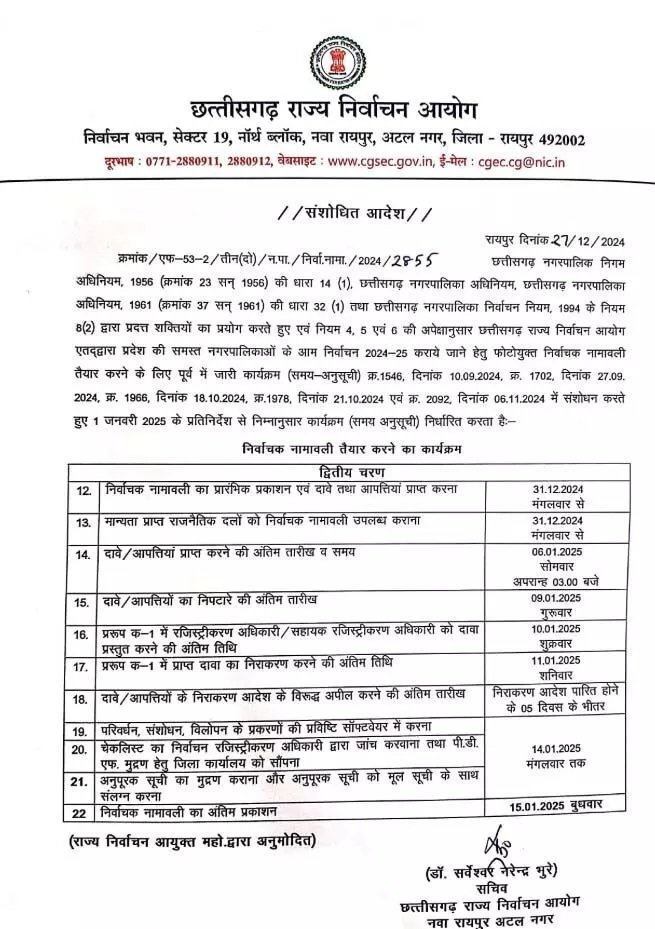 रायपुर : राज्य निर्वाचन आयोग ने वोटर लिस्ट पुनरीक्षण का कार्यक्रम जारी कर दिया है। सचिव डॉ सर्वेश्वर भूरे के मुताबिक सूची का प्रारंभिक प्रकाशन 31 दिसंबर को होगा। इसमें छूटे या नए नाम जुड़वाने की अंतिम डेट 6 जनवरी और अंतिम प्रकाशन 15 जनवरी तय की गई है। यानी निकाय और पंचायत चुनाव उसके बाद ही कराए जा सकेंगे।