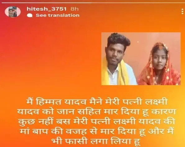 स्टेटस में लिखा था: “मैं हिम्मत यादव मैने अपनी पत्नी लक्ष्मी यादव को जान सहित मार दिया हूँ। कारण कुछ नहीं बस मेरे पत्नी लक्ष्मी यादव के मां बाप की वजह से मारा हूँ और मैं खुद भी फांसी लगा कर जान दे रहा हूँ…”