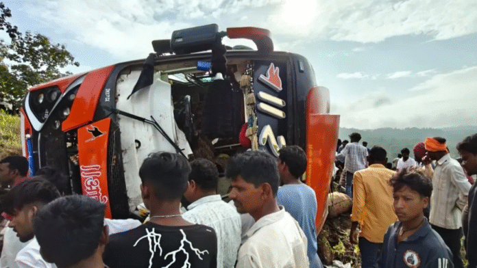 बड़वानी के पुलिस अधीक्षक जगदीश डावर ने बताया कि बस फिसलने के बाद डिवाइडर से टकराकर पलट गई।
