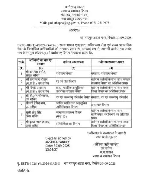officer transfer  रायपुर, 30 सितंबर 2025 | छत्तीसगढ़ में प्रशासनिक स्तर पर एक बार फिर बड़ा फेरबदल देखने को मिला है। राज्य प्रशासनिक सेवा के 6 अधिकारियों का तबादला किया गया है। यह बदलाव ऐसे समय हुआ है जब विकास शील ने हाल ही में राज्य के नए मुख्य सचिव के रूप में पदभार ग्रहण किया है।