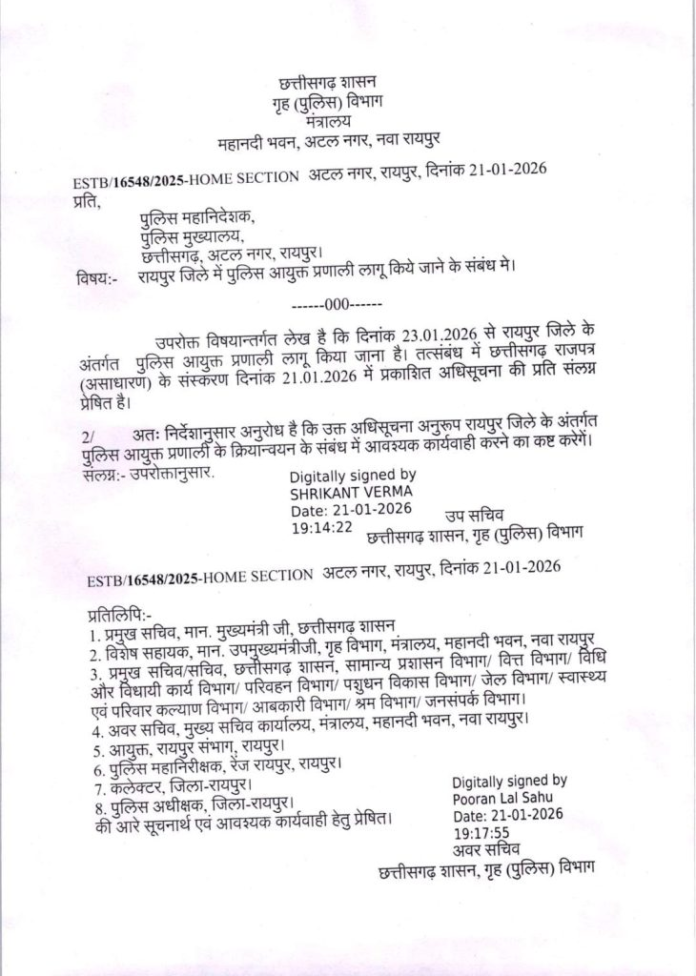 रायपुर। छत्तीसगढ़ की राजधानी में अपराध नियंत्रण और सुरक्षा व्यवस्था को अत्याधुनिक बनाने की दिशा में शासन ने बड़ा कदम उठाया है। रायपुर में अब पुलिस कमिश्नर प्रणाली (Police Commissionerate System) लागू कर दी गई है। गृह (पुलिस) विभाग द्वारा जारी अधिसूचना के अनुसार, यह नई व्यवस्था 23 जनवरी 2026 से प्रभावी होगी।