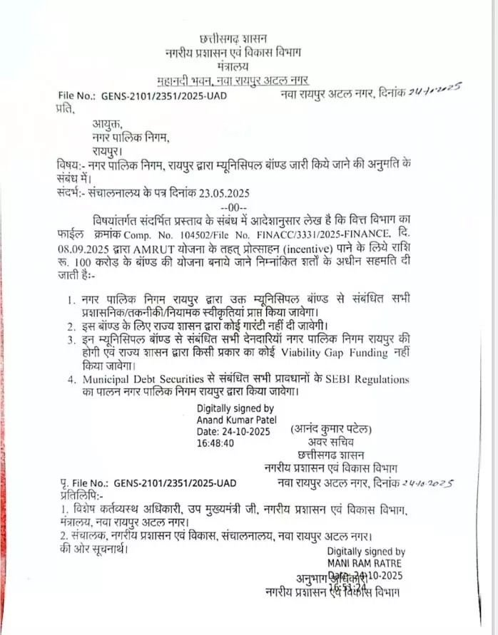 Raipur Municipal Bond रायपुर | 25 अक्टूबर 2025| राजधानी रायपुर के विकास कार्यों को गति देने के लिए नगरीय प्रशासन विभाग ने नगर निगम रायपुर को 100 करोड़ रुपए के म्यूनिसिपल बॉन्ड जारी करने की अनुमति प्रदान की है। विभाग ने यह अनुमति चार विशेष शर्तों के साथ दी है।