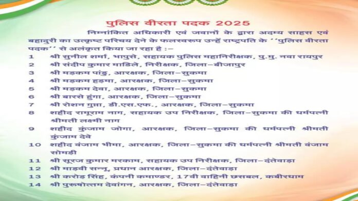 रायपुर। 26 जनवरी 2026, गणतंत्र दिवस के पावन अवसर पर छत्तीसगढ़ पुलिस के लिए गर्व का क्षण होगा। राजधानी रायपुर के पुलिस परेड ग्राउंड में आयोजित राज्य स्तरीय समारोह के दौरान 14 पुलिस अधिकारी और जवानों को पुलिस वीरता पदक से अलंकृत किया जाएगा। यह सम्मान उन्हें कर्तव्यनिष्ठा, अदम्य साहस और उत्कृष्ट सेवा के लिए प्रदान किया जाएगा।