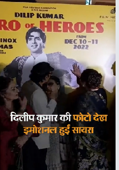 सुपरस्टार दिलीप कुमार की आज 100वीं बर्थ एनिवर्सरी है। इस मौके पर हेरटेज फाउंडेशन की तरफ से ‘हीरो ऑफ हीरोज’ फिल्म फेस्टिवल का आयोजन किया गया है, जिसमें दिलीप साहब की फिल्मों की दोबारा से स्क्रीनिंग हुई। वहीं इस मौके पर उनकी पत्नी सायरा बानो भी इस इवेंट में शामिल हुईं। अब इस इवेंट का एक वीडियो सामने आया है, जिसमें सायरा दिलीप कुमार का पोस्टर देख इमोशनल हो जाती हैं।