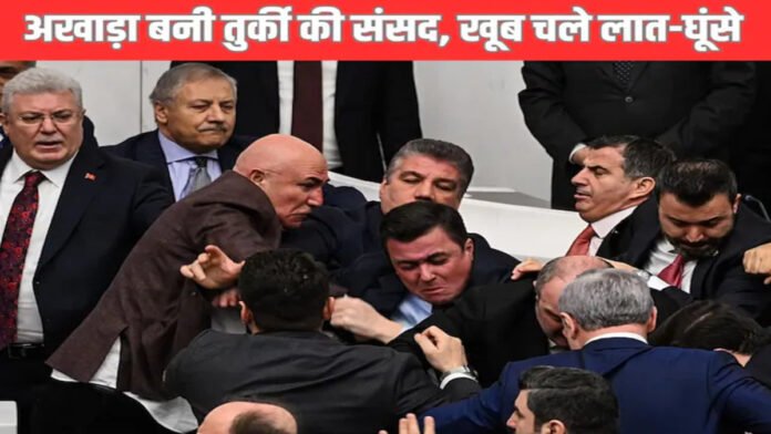 Turkey Parliament Turned into WWE : तुर्की। लोकतांत्रिक देशों की संसदें आमतौर पर बहस और नीतिगत चर्चा के लिए जानी जाती हैं, लेकिन तुर्की की संसद में बुधवार को जो नजारा देखने को मिला, उसने सभी को हैरान कर दिया। कैबिनेट फेरबदल के बाद संसद के भीतर ऐसा हंगामा हुआ कि पूरा सदन कुछ देर के लिए कुश्ती के अखाड़े में बदल गया।