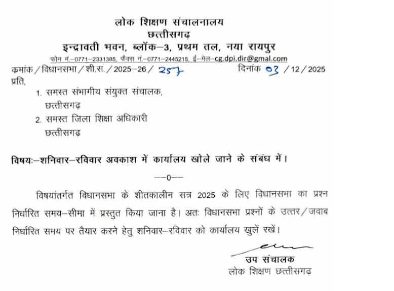 विधानसभा सत्र के मद्देनजर, प्रशासन ने तत्काल प्रभाव से शनिवार और रविवार को भी सरकारी दफ्तरों को खुला रखने का आदेश दिया है। सत्यपाल सिंह राजपूत (संबंधित रिपोर्टर, रायपुर) की अधिकारियों को यह सुनिश्चित करने के निर्देश दिए गए हैं कि विभाग से संबंधित सभी सवालों के जवाब समय सीमा के अंदर और पूरी सटीकता के साथ विधानसभा में प्रस्तुत किए जाएं।